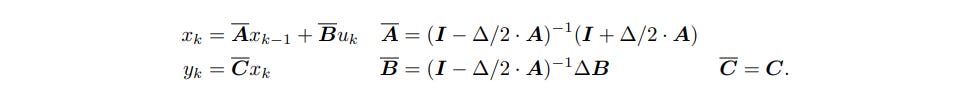 Now A,B,C,D are taken as parameters to be determined by gradient descent. This model by itself is not accurate enough however to be used to learn most tasks in machine learning, and thus a modified version, called the discrete-time SSM, where a step size delta is introduced that represents the resolution of the input, and the SSM converts a input sequence to an output sequence. In addition, some strong constraints are placed on A to make it more amenable to analysis, and an approximate state matrix A overline is used instead of A as a target to learn, eith the following equations being in effect: